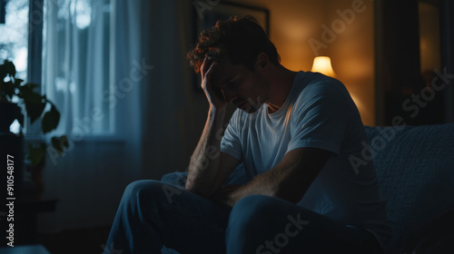 awareness, supporting, feeling, caucasian, man, sitting, couch, night, indoor, sorrowful, depression, solitude, stress, anxiety, loneliness, reflective, contemplative, night time, thoughtful, introspective, pensive, sombre