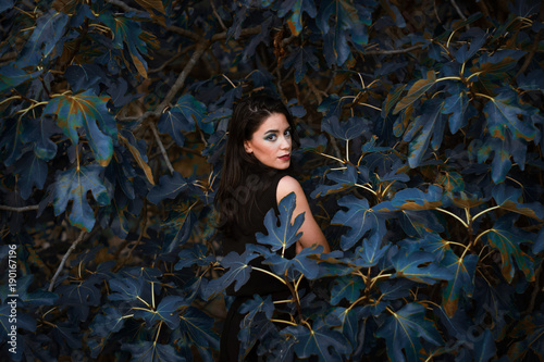 a Caucasian model poses, surrounded by blue leaves and looks at you taking you into her magical world