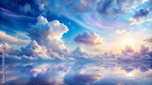 A celestial canvas of ethereal clouds reflected in a tranquil sea, where sunlight paints the sky with vibrant hues.
