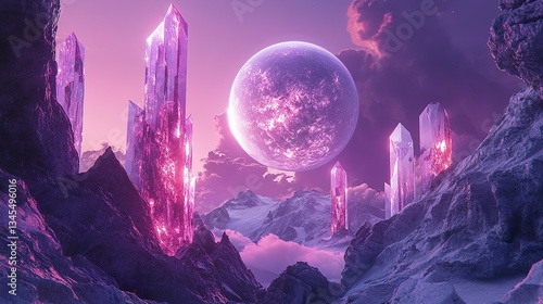 fantasy, crystal, planet, mountain, landscape, purple, sky, cloud, light, glowing, space, rock, peak, horizon, terrain, aethereal, dreamy, fantastic, nature, surface, formation, structure, environment, scene, vista, view, dawn, dusk, twilight, cosmos, celestial, luminescent, sphere, icy, cold, snow, texture, abstract, background, artistic, design, digital, vibrant, creative, element, composition