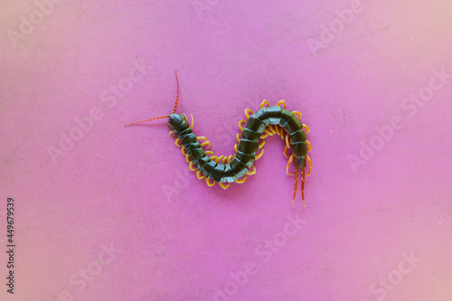 A centipede on a pink background. It is a poisonous animal and has a lot of legs.