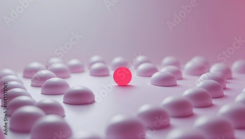 A central vivid pink sphere stands out among numerous white domes, illustrating the theme of social isolation within a minimalist setting. The composition evokes contemplation on loneliness