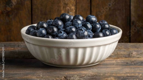 A ceramic bowl filled with fresh blueberries, placed on a rustic wooden table.