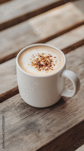 A ceramic mug filled with cappuccino sits on rustic, weathered wood table surface