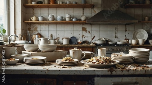 A chaotic kitchen scene with stacks of dirty plates, mugs, and bowls cluttering the countertops. Unwashed dishes, food scraps, and grime create a raw, unfiltered look at post-meal reality
