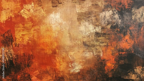 A chaotic pattern of overlapping brushstrokes in earthy tones on a textured canvas.