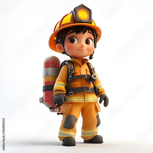 cartoon, three-dimensional, render, children, brave, hero, cute, adorable, helmet, uniform, orange, yellow, equipment, safety, protection, rescue, emergency, tank, oxygen, hose, little, children, toddler, small, miniature, young, character, animation, digital, art, illustration, design, graphic, image, studio, background, white, rendering, firefighter