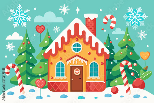 A charming Christmas house with a festive tree in a snowy winter landscape, perfect for a holiday card illustration