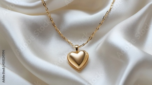 A charming gold heart-shaped pendant necklace resting on white satin with soft folds