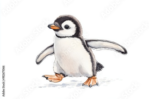 A charming illustration of a young penguin walking playfully on a white background, capturing the essence of these delightful birds.
