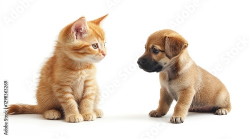 A charming orange tabby kitten perched on a pristine white backdrop, gazing leftward with tilted ears, exuding adorable curiosity and grace in every delicate whisker twitch. (130 characters)