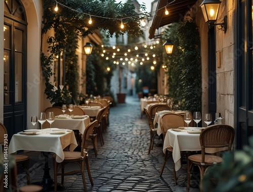 A charming outdoor food cafe on a cobblestone street, featuring small tables with elegant tableware and plates of fresh pasta, bread, and wine glasses, generative ai