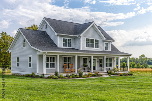 farmhouse, renovated, exterior, siding, paint, grey, white, black, roof, lawn, green, blue skies, cloud, fluffy, porch, flower, plant, home, house, country, suburban, rural, peaceful, charming, inviting, comfortable, traditional, architecture, landscape, real estate, home improvement, nature, daytime, summer, sunny