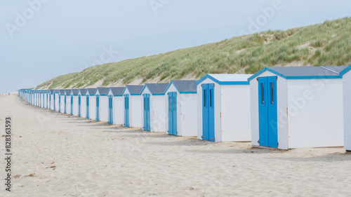 A charming row of blue and white beach huts standing tall on the sandy shores, creating a picturesque scene against the clear blue sky. De Koog beach Texel