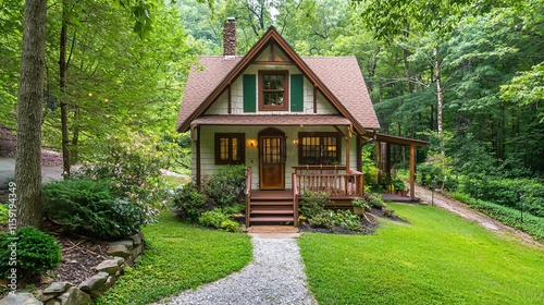 A charming, rustic cottage nestled in lush greenery, featuring a welcoming porch and a stone pathway surrounded by vibrant plants and trees.