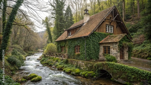 A charming rustic cottage with ivy covering the walls and a steeply pitched wooden roof, surrounded by dense woodland and a babbling brook, babbling brook, rural landscape, forest scenery
