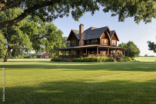 farmhouse, rustic, country house, home, real estate, property, architecture, building, exterior, landscape, lawn, grass, tree, green, nature, rural, countryside, summer, day, sunlight, shadow, porch, veranda, outbuilding, barn, sky, clear, idylli, peaceful, tranquil, serene, beautiful, charming, picturesque, american, traditional, chimney, window, front yard, greengrass, landscaping