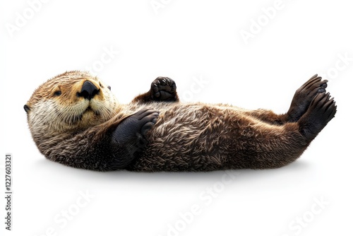 A charming sea otter lies on its back in a peaceful pose, showcasing its fluffy coat and playful nature, set against a clean white background for focus.