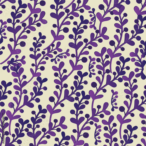 A charming seamless botanical pattern with stylized purple branches and berries. Reflecting trends in organic and whimsical designs, it's perfect for textiles, stationery, and decor.