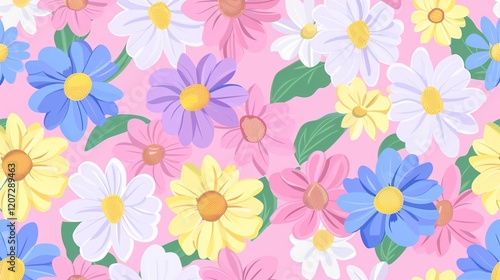 A charming spring background adorned with an array of spring flowers and delicate daisies. The vibrant colors and sweet scents of these blossoms create a refreshing and inviting atmosphere