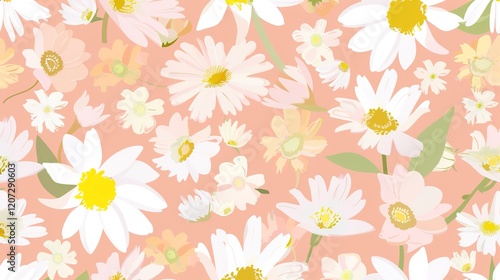 A charming spring background adorned with an array of spring flowers and delicate daisies. The vibrant colors and sweet scents of these blossoms create a refreshing and inviting atmosphere