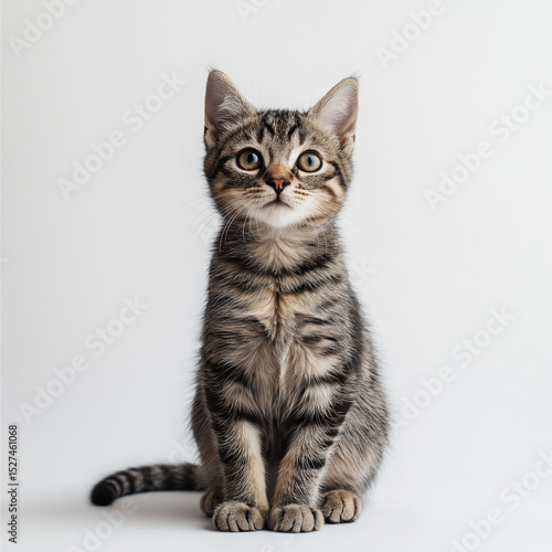 A charming striped kitten sits poised, with its curious eyes fixed forward, radiating an irresistible appeal, while also captivating in its cuteness.