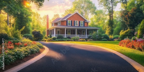 A charming two-story brick house with a large porch surrounded by vibrant greenery and colorful flower beds along a curved asphalt driveway under a warm, glowing sunset sky