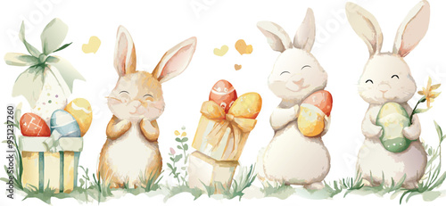 A charming watercolor illustration featuring a cute bunny surrounded by colorful eggs and festive presents, perfect for celebrating the joy and spirit of Easter.