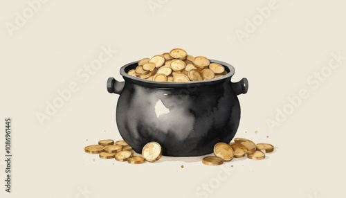A charming watercolor illustration of a black pot overflowing with gold coins, symbolizing prosperity and luck for St. Patrick's Day festivities in a cheerful setting