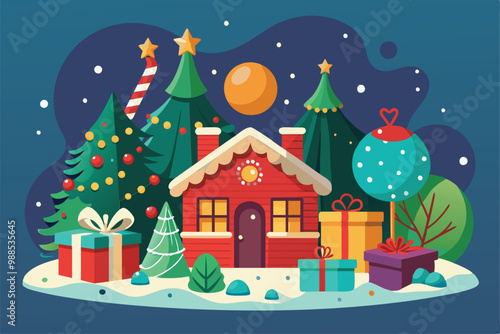 A charming winter cabin surrounded by decorated trees and vibrant gift boxes, creating a joyful and festive Christmas atmosphere.