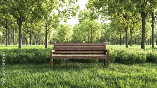 A charming wooden bench in a lush park, surrounded by nature, placed against a clean white background for artistic focus.
