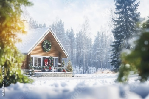 A charming wooden cabin sits in a snow covered forest, adorned with holiday decorations. Morning light filters through the trees, creating a serene and magical winter atmosphere filled with nostalgia