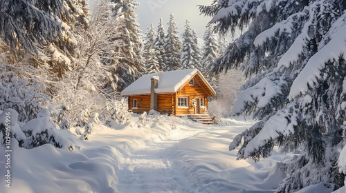 charming, wooden, cabin, surrounded, snow-covered, tree, inviting, explore, winter, wonderland, along, winding, path, enchanted, wood, illustration