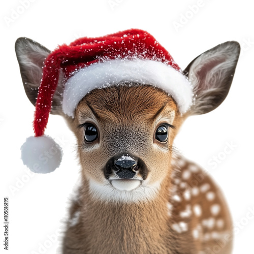 A charming young deer in a red and white Santa hat, sprinkled with snowflakes