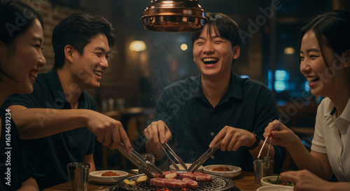 A cheerful Asian food influencer laughing with friends at a Korean BBQ restaurant