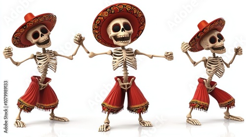 A cheerful 3D skeleton character in a sombrero, striking different celebratory poses with a white background.