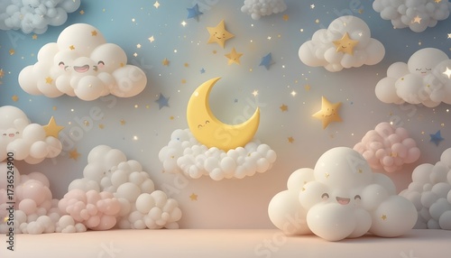 whimsical, dreamy, moon, star, cloud, pastel, blue, yellow, pink, sparkle, glow, cute, happy, sleep, smiling, gentle, childcare center, children, baby, render, three-dimensional, soft, fluffy, volumetric, light, sweet, cosy, bedtime, sky, night, magical, celestial, decor, adorable, ball-shaped, puffy, white, gold, wallpaper, illustration, vector, peaceful, cheerful