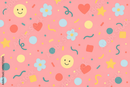 A cheerful and vibrant background pattern featuring playful shapes and emojis, perfect for use in creative designs and cheerful projects.