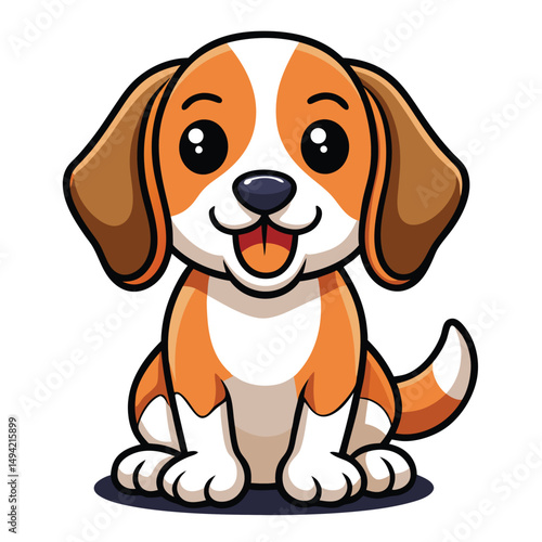 A cheerful beagle puppy with brown and white fur and floppy ears sits with its tongue out a white background