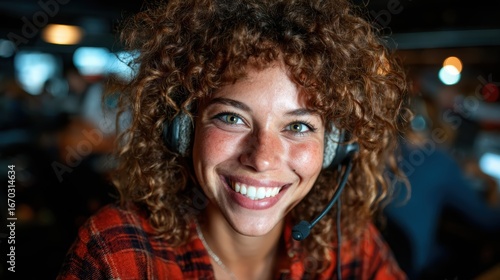 A cheerful call center employee with curly hair and headset, smiling at the camera, embodying professionalism and a friendly customer service atmosphere.