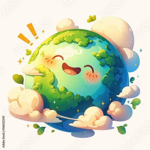 A cheerful cartoon Earth surrounded by clouds and greenery, promoting environmental awareness.