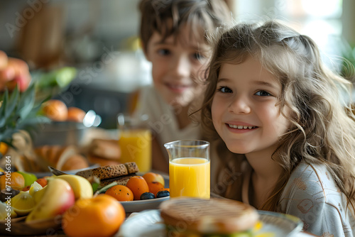 A cheerful children enjoys a healthy breakfast together in their kitchen, sharing fresh fruits and juice, creating a happy and nutritious start to the day.