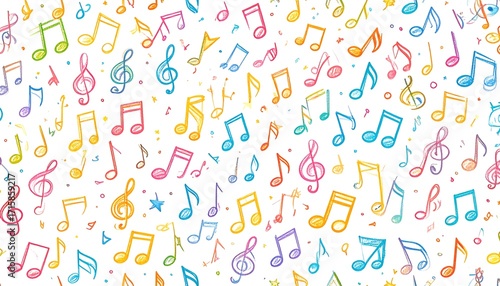 A cheerful, colorful musical notes pattern, filled with playful doodle style musical symbols, set against a white background.