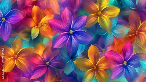 A cheerful, colorful pattern of tropical flowers. It's a modern, abstract design, perfect for printing.