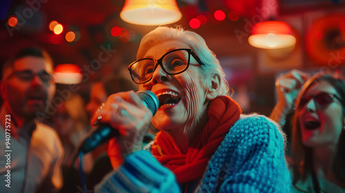 A cheerful elderly lady in funny glasses sings karaoke with her friends in a retro-style bar as night falls