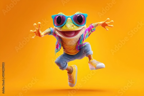 animation, orange, image, stylish, leaping, illustration, design, spring, three-dimensional, blue, vibrant, cheerful, fun, colourful, clothing, fashion, excited, yellow, summer, playful, frog, happy, art, stylised, modern, cartoon, character, creative, jumping, high-coloured, graphic, pink