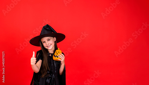 a cheerful girl in a witch costume holds a pumpkin on a red background with a copy of the space