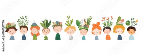 A cheerful group of diverse children wearing whimsical plant-themed headpieces, celebrating nature and friendship together