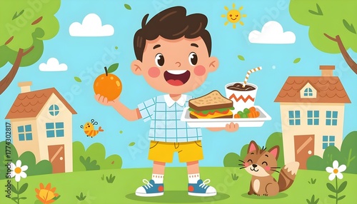 A cheerful illustration of a boy holding a plate of food, accompanied by a friendly fox, set in a bright and colorful outdoor environment, promoting joy and childhood innocence.