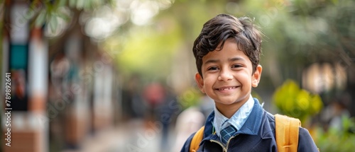 A cheerful Indian school boy smiles for the camera in his school uniform, copy space, banner